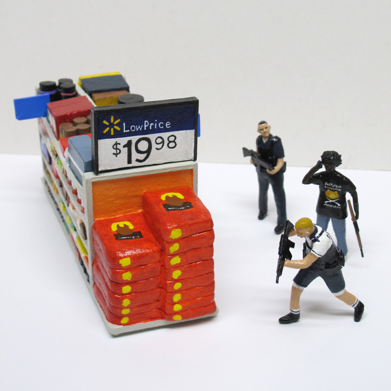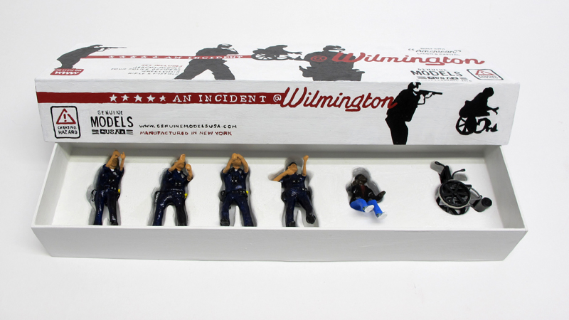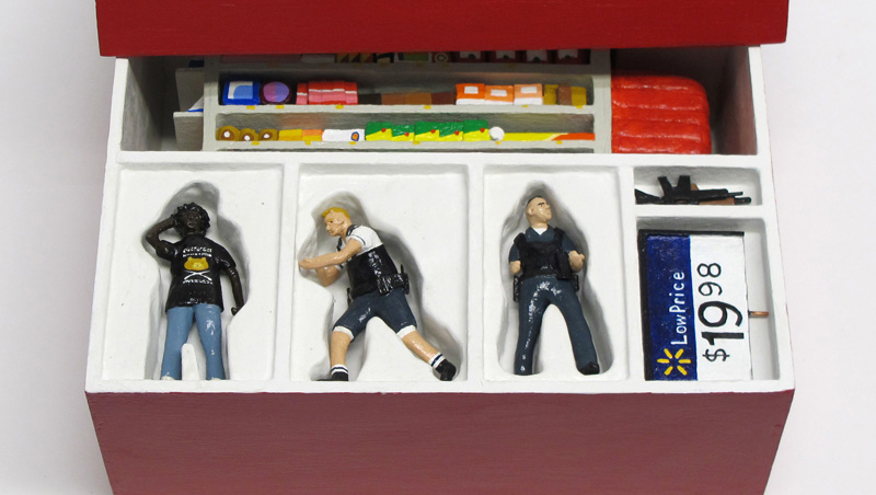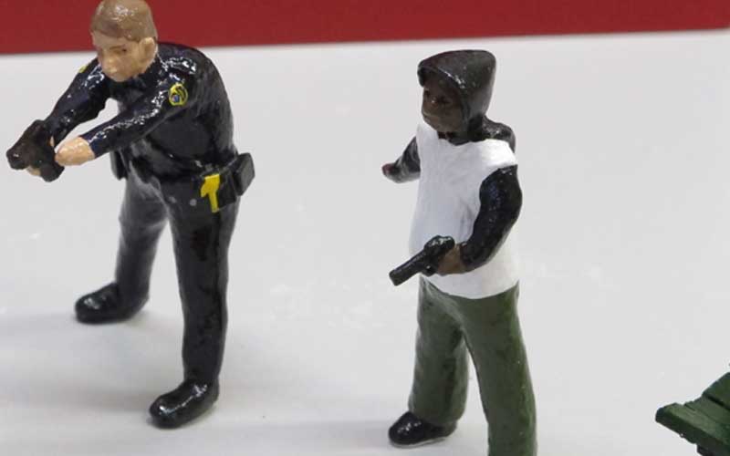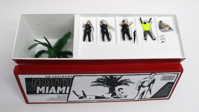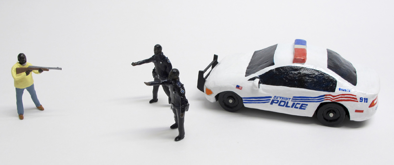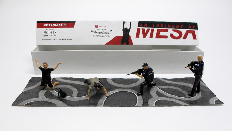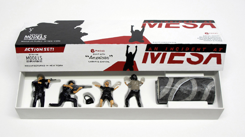 Includes two police figures, two prone civilian figures, stray purse, carpet patterned after the hallway where the shooting occurred.