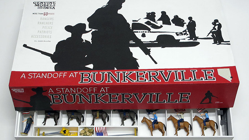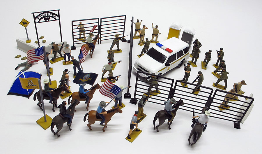 Includes more than 30 figures: state police, national guard, ranchers their allies; SUV, tent, porta-potties, barriers, accessories.