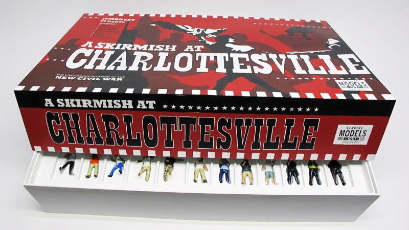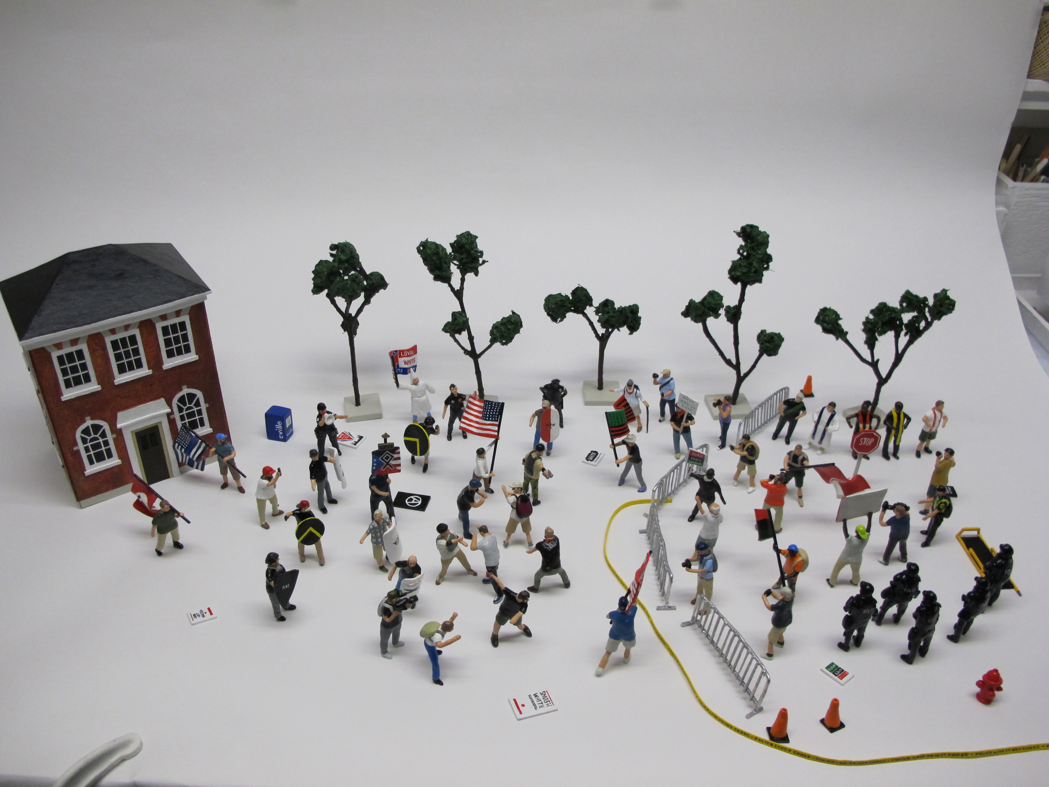 Includes over 60 figures: protesters, counter-protesters, police, and clergy; snap-together courthouse, accessories.