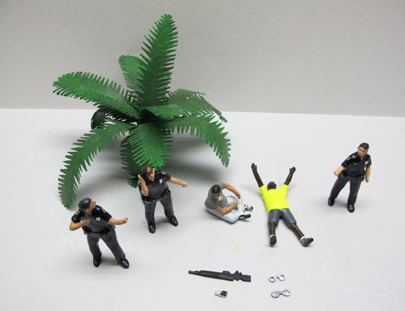 Includes three police figures with detachable weapons, two civilian figures, palm tree, handcuffs, cellphone.